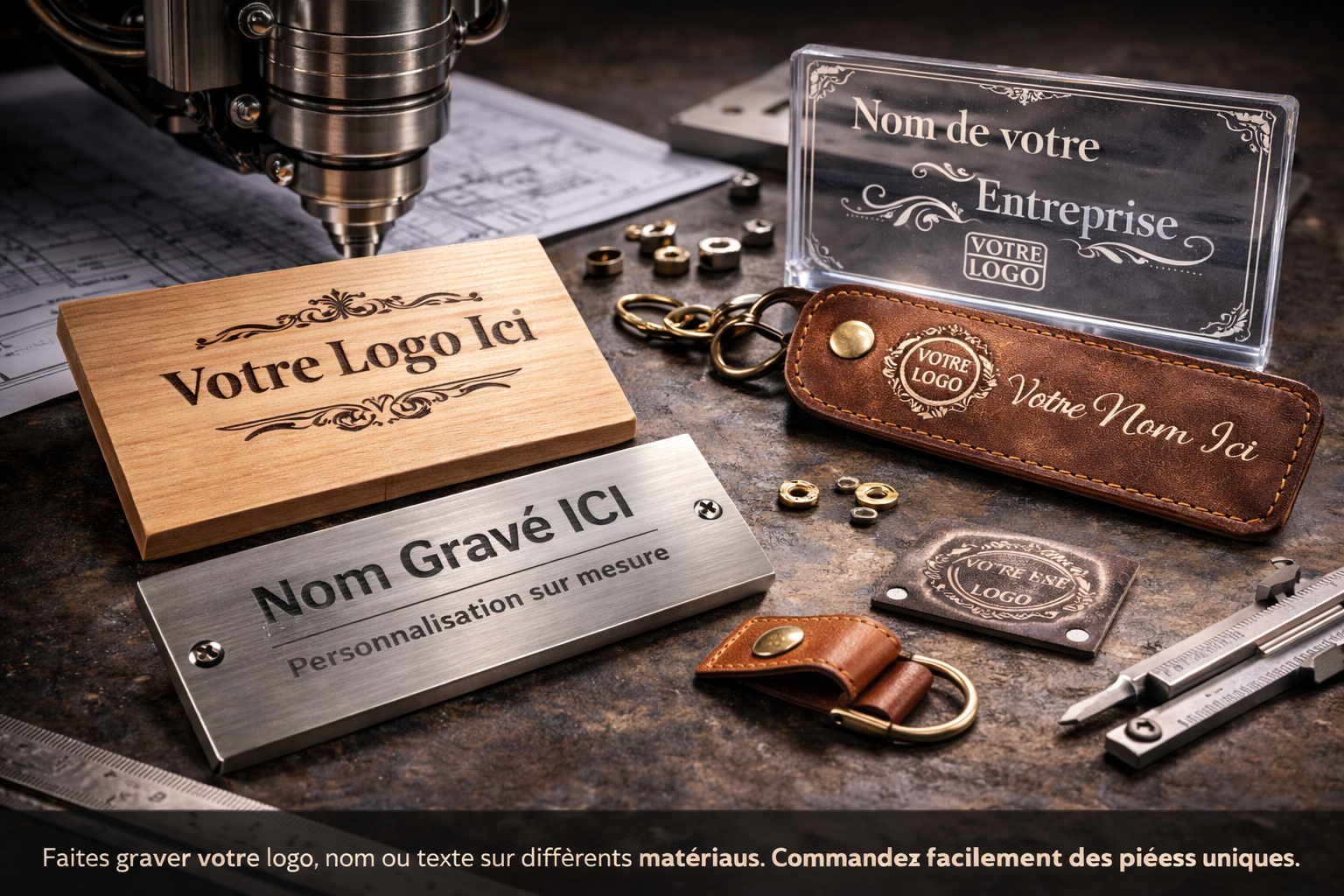 Personnalisation de pièces métalliques, plaques signalétiques, logos gravés et pièces techniques. Précision et durabilité garanties.